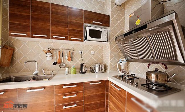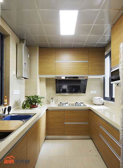 原木色的厨房选择定制橱柜更加能出效果,选择浅色的墙砖地砖比较协调,个人觉得哑光的仿古砖更有逼格。