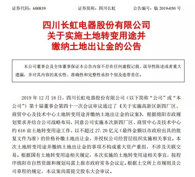 12月18日,长虹集团发布公告,将开展实施新四厂区、商贸中心及技术中心约616亩土地转变用途工作。这意味着,酝酿已久的高新区长虹家电城整体搬迁事宜,开始提上日程。