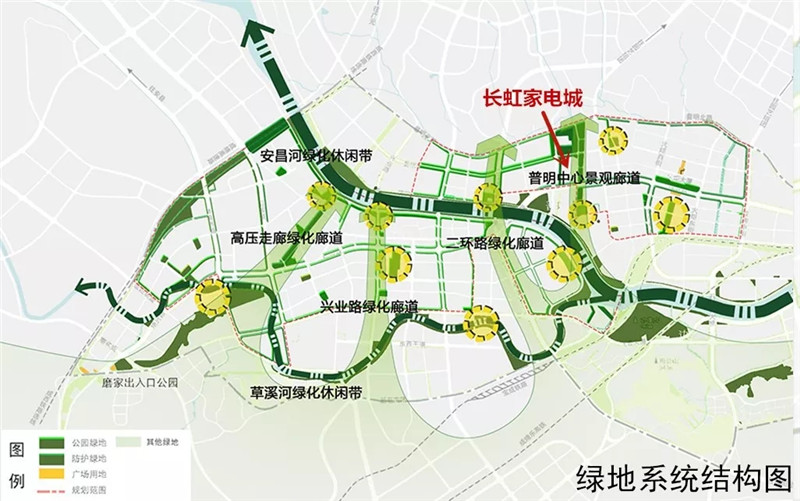 根据高新区部分区域控制性详细规划显示,长虹家电城所在的绵兴东路未来将作为高新区城市主轴线,沿轴线打造普明生产服务中心、永兴城市次中心、九洲体育会展中心。长虹家电城南部,是规划中心的普明中心景观廊道,周边规划有公园绿地、广场用地。