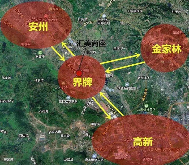 从卫星图来看,项目所在的区域是绵阳城市西部,高新、金家林、安州三区互联的交通枢纽,与周边区域联系密切。大致位置关系如下图: