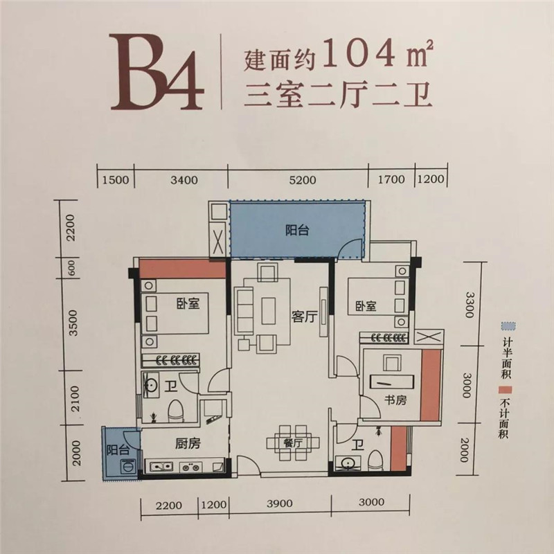 B4户型建面约104㎡,位于1、3号西北朝向的一户,是B3户的镜面户型。该户型同样为双阳台设计,三侧采光,保障了良好的通风条件。5.2X2.2m的景观阳台、2X1.5m的生活阳台全部为半赠送面积,整个户型的全赠送面积加起来也接近20个平方。