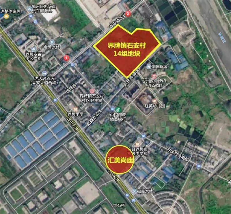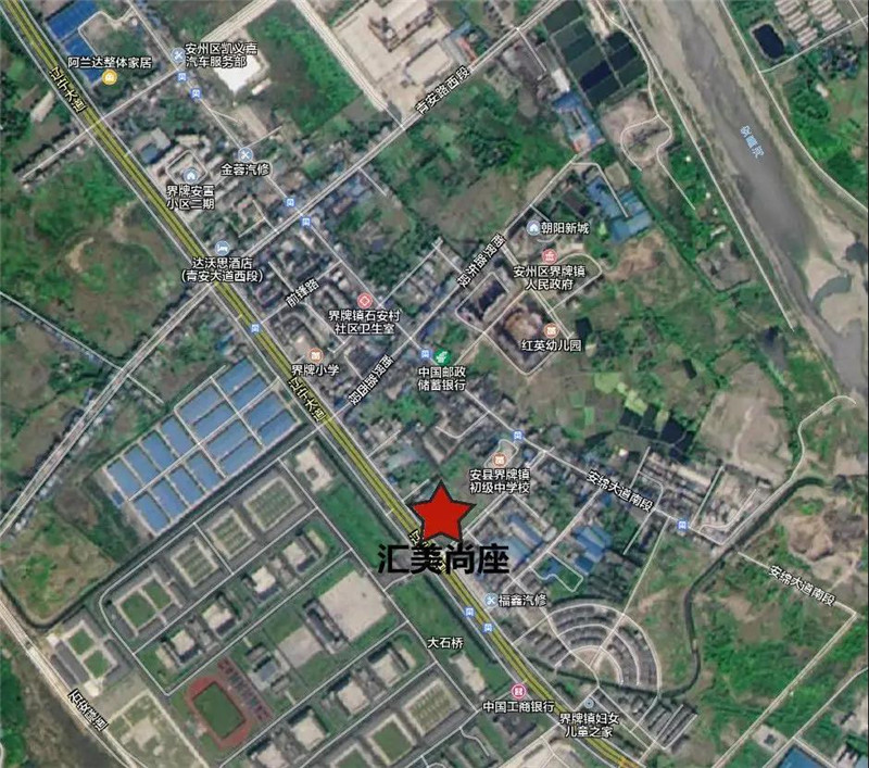 汇美尚座位于安州区辽宁大道与界中路交汇处,项目东侧是安州界牌中学;北面是已经搬迁完毕等待规划的粮食厂区;南侧临街是界中路,一街之隔是界中路自建居民点;西面隔辽宁大道,对侧是77123部队。