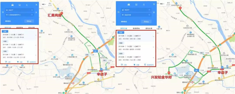 不堵车的情况下,从汇美尚座出发驾车至辛店子,约10-11分钟车程;从兴发铂金华府驾车至辛店子,约11-13分钟车程。