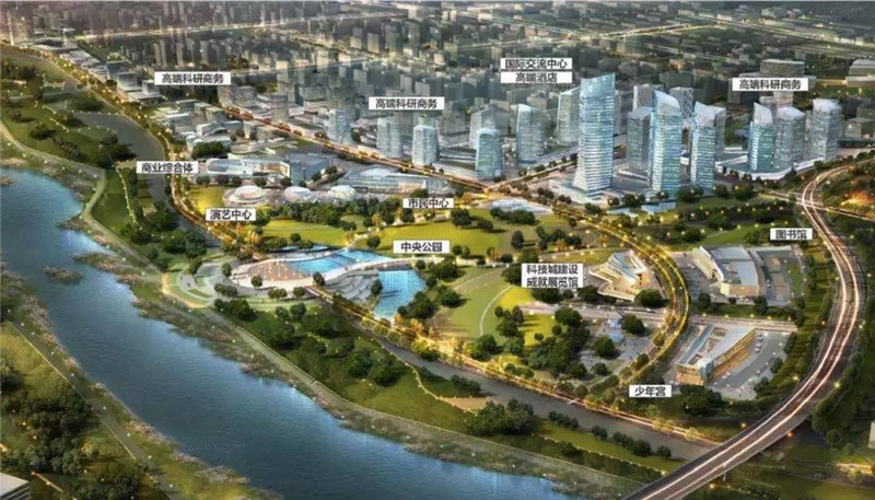 沿河设置有中央公园、水岸广场、文化环廊、展览馆、商业综合体等等,目前“科技之心”中央公园正在加快建设。