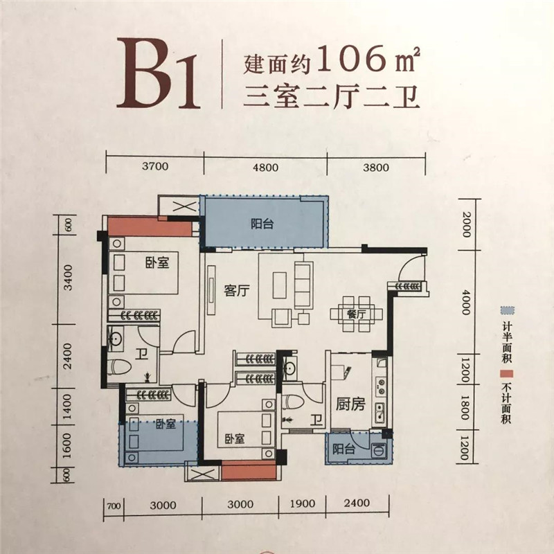 B1户型建面约106㎡,分布于1、3号楼临辽宁大道的左边户,仅有一个卧室和一个次卫朝向交通主干道。客餐厅为面宽7.3m的横厅设计,4.8X2m景观阳台保障了良好的观景视野。客厅、主卧和两个次卧开间分别为4.8m、3.7m、3m、3m。