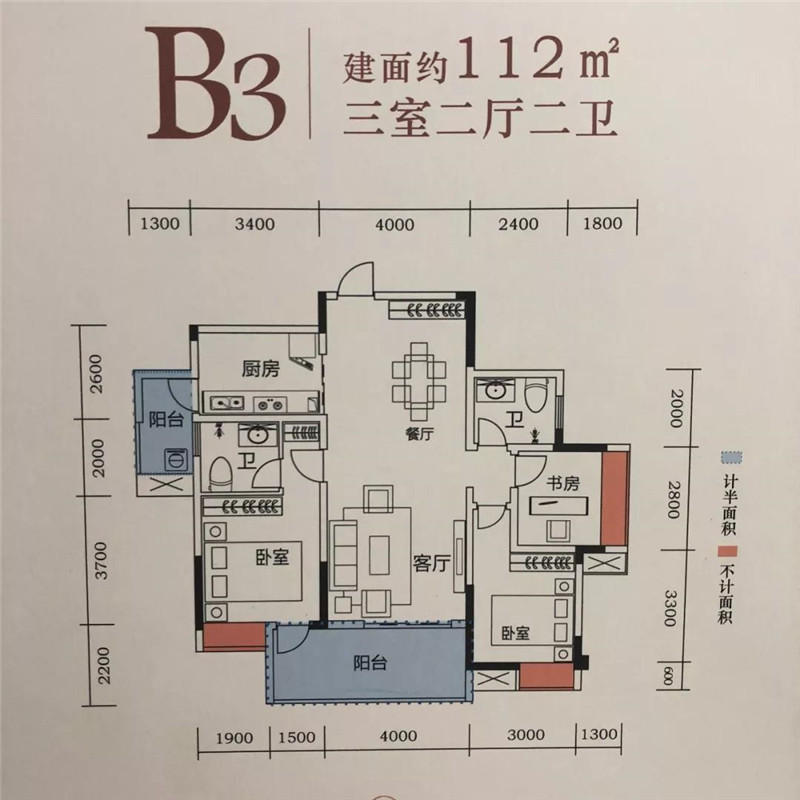 B3户型建面约112㎡,分布于1、3号楼东南朝向的一户。该户型为双阳台设计,5.5X2.2m的景观阳台、开间1.3m 的生活阳台全部为半赠送,加上全赠送面积应该近20个平方。
