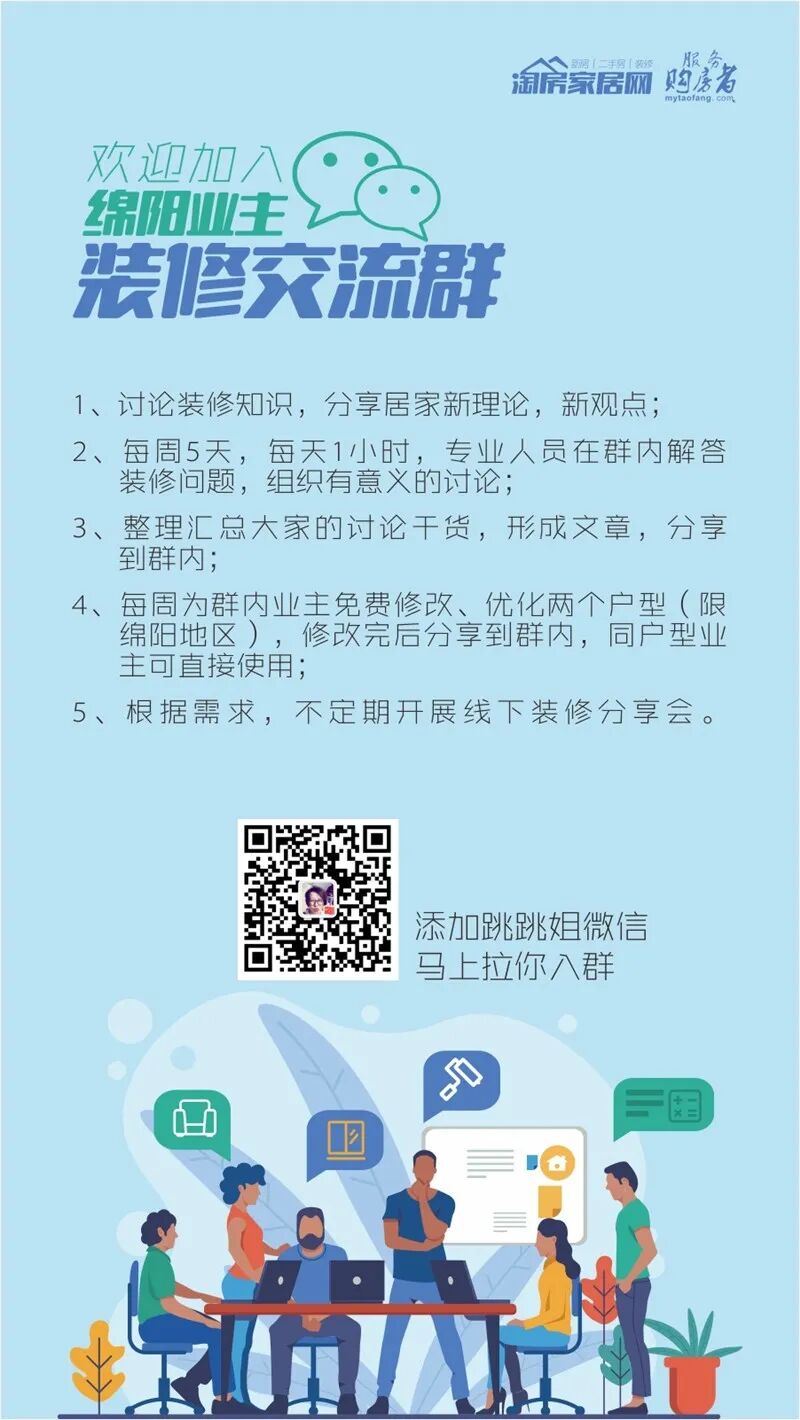 为了让即将装修的亲们有个互相讨论,互相帮助的地方,建立了绵阳装修群,如果你是即将要装修的,或者装修爱好者,淘房家居网(淘房好装)铁粉,扫描下图二维码,暗号:装修群,入群可以获得如下福利: