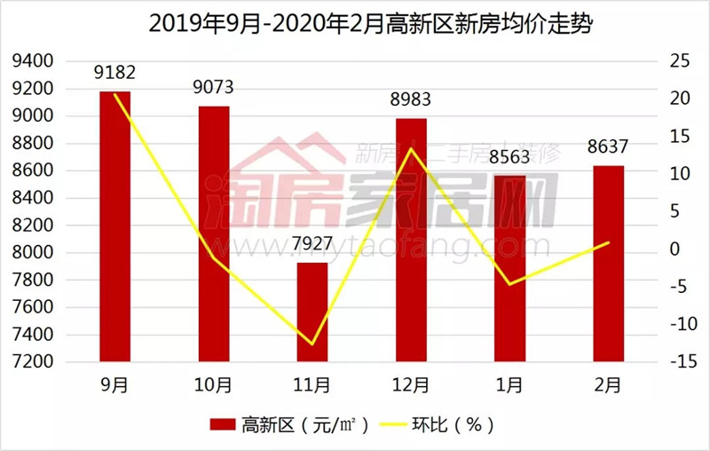 高新区2月新房成交量跌价升,环比上涨0.86%,每平米上涨74元。与1月份相比,差距不大。