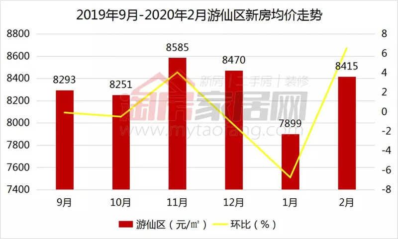 游仙区新房均价环比上涨6.53%,每平米上涨516元。与1月份相比,价格有回升。