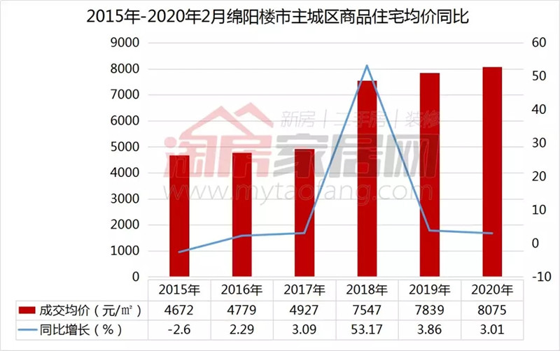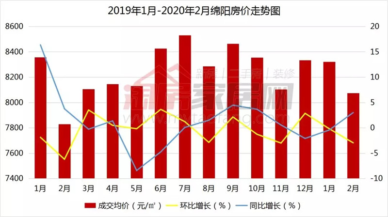 2月绵阳主城区新房成交均价8075元/㎡,环比下跌2.96%,从走势来看,这一波价格下跌是从2019年12月开始的。