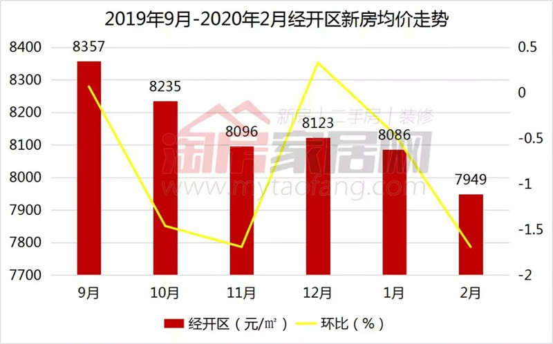 经开区新房成交量升价跌,环比下跌1.69%,每平米下降137元。相比1月份,受折扣促销带动了成交也拉低了均价,跌破了8K,也是唯一不在8K梯队的区域。