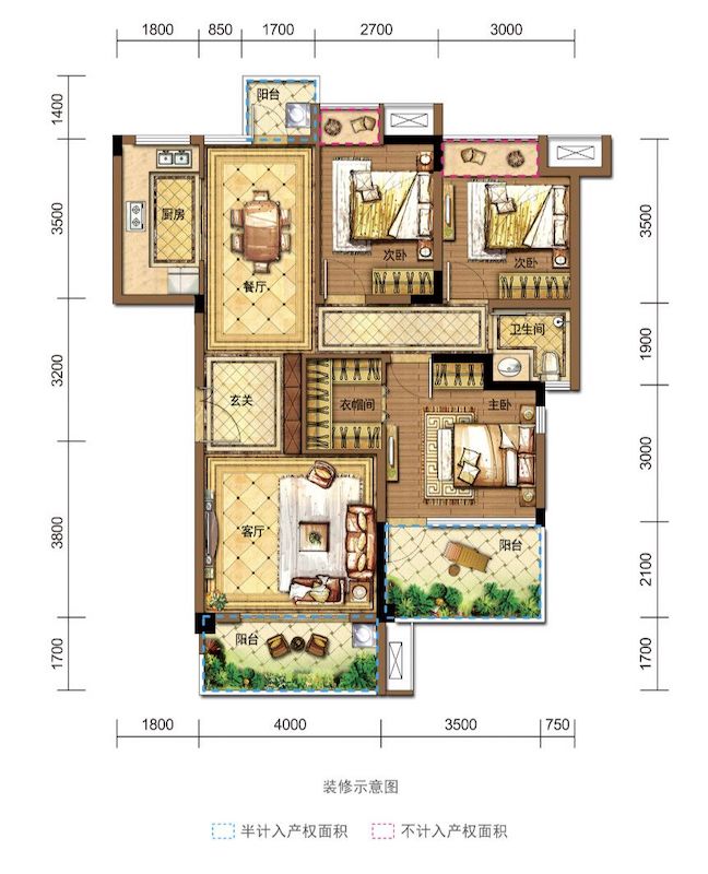 D3户型为四房设计,建面约121.18㎡,该户型有三个阳台。