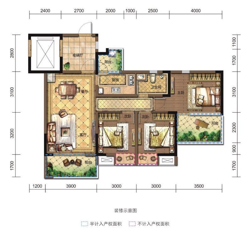 C3户型分布于2号楼临街的四户,西南朝向,建面约104.97㎡,为三房设计。这个户型的朝向很好,踩盘当天是下午3点多,最近的天气很好,每一个房间都能照到阳光。有三个阳台,起居室的尺度规划也更合理。2号楼的清水样板房目前已经开放,踩盘当天去看的时候,最直观的感受是,很巴适。在一楼架空层的电梯处,一共有四个方位,分别对应着朝向内外的四户。假设是1单元C2户型的业主,可以乘坐最内侧靠近右边的电梯直达家门口,也就是通常所说的电梯入户。家门口的电梯厅是完全赠送给业主的,可以当作入户玄关使用。