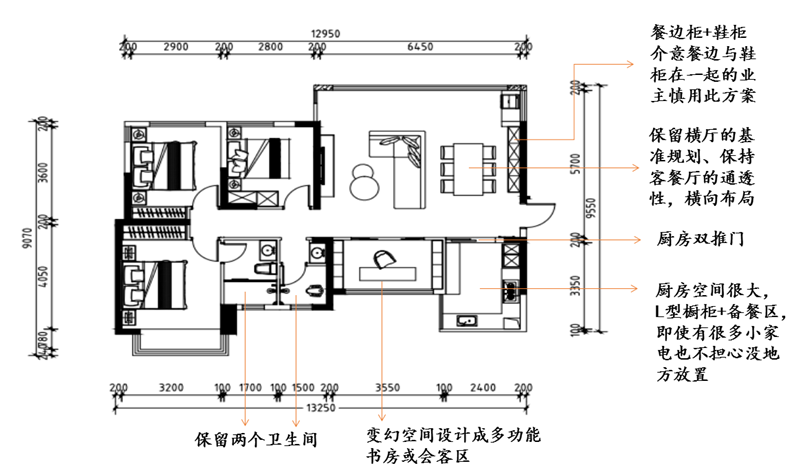 朱丽叶:方案一和方案二主要还是客餐厅、厨房以及变幻空间的规划不同出发。