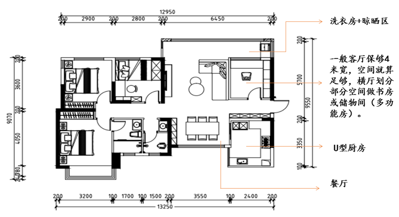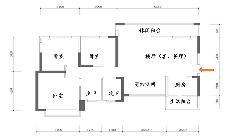 朱丽叶:从户型图和尺寸看,格局还是很不错,我的理想型,横厅意味着南北通透,空间感很大,而且这个户型可变幻空间给了我们更多可规划区域,让空间布置多元化,更合理。