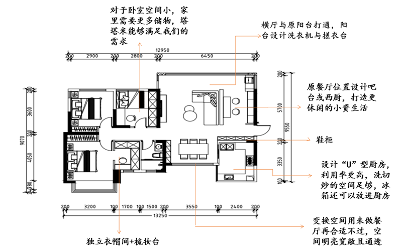 朱丽叶:其实我个人还比较喜欢方案三,方案一、二在扩大厨房之后并没有保留生活阳台,客厅阳台虽然打通做了洗衣区,但是并没有明确规划晾衣区,且客餐厅太通透。