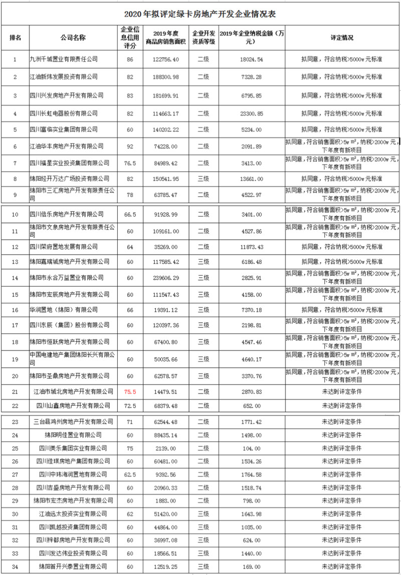 一、2020年绵阳房地产“服务绿卡”企业评定出炉