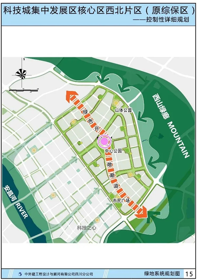 规划形成“一核多点,廊道渗透”的绿地系统。其中“一核”为中心绿地;“多点”为山体公园、市民广场及多个居住区公园;“廊道渗透”则通过南北向绿色开敞廊道以及沿路绿化组成的廊道网络将西山绿廊及安昌河绿色界面渗透至社区街坊。
