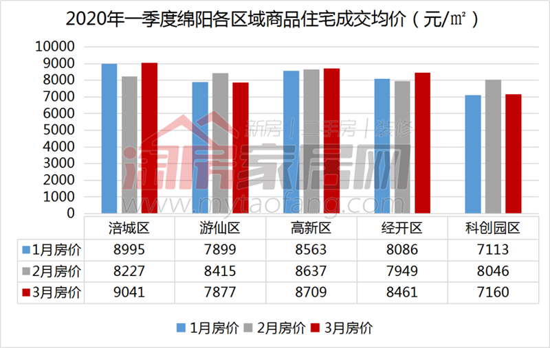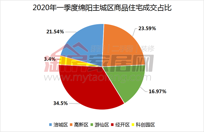 从各区域的成交占比来看,经开区、高新区以及涪城区三足鼎力,占比一季度绵阳主城区商品房成交的79.63%。