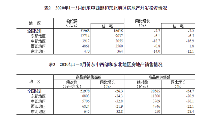 2020年一季度,全国房地产开发投资额、住宅投资额同比下降;房地产开发企业房屋施工面积、住宅施工面积同比增长;