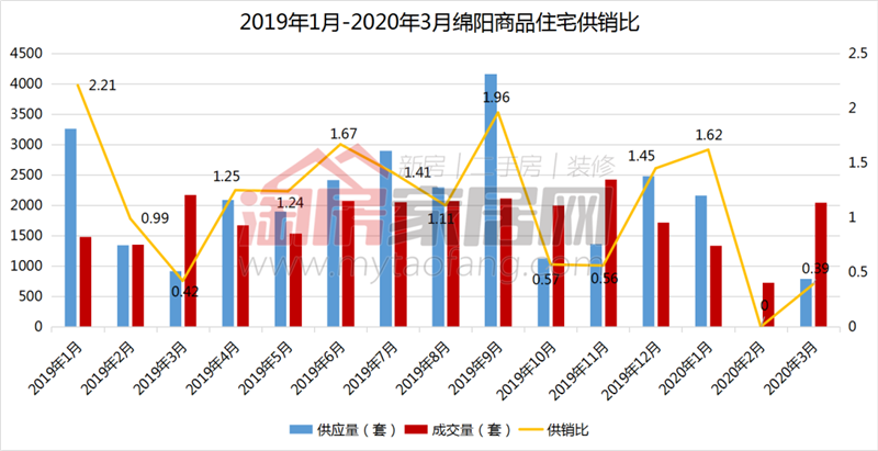 除2月特殊情况,售楼部、工地、土地交易被迫关闭暂停,全国宅家抗疫,返乡置业爽约,因而整体销售数据呈现出“断崖式”。一季度绵阳商品住宅供销比在3月拉大,约为0.39,供需情况仍然是供小于求,跌到最近一年的最低点。