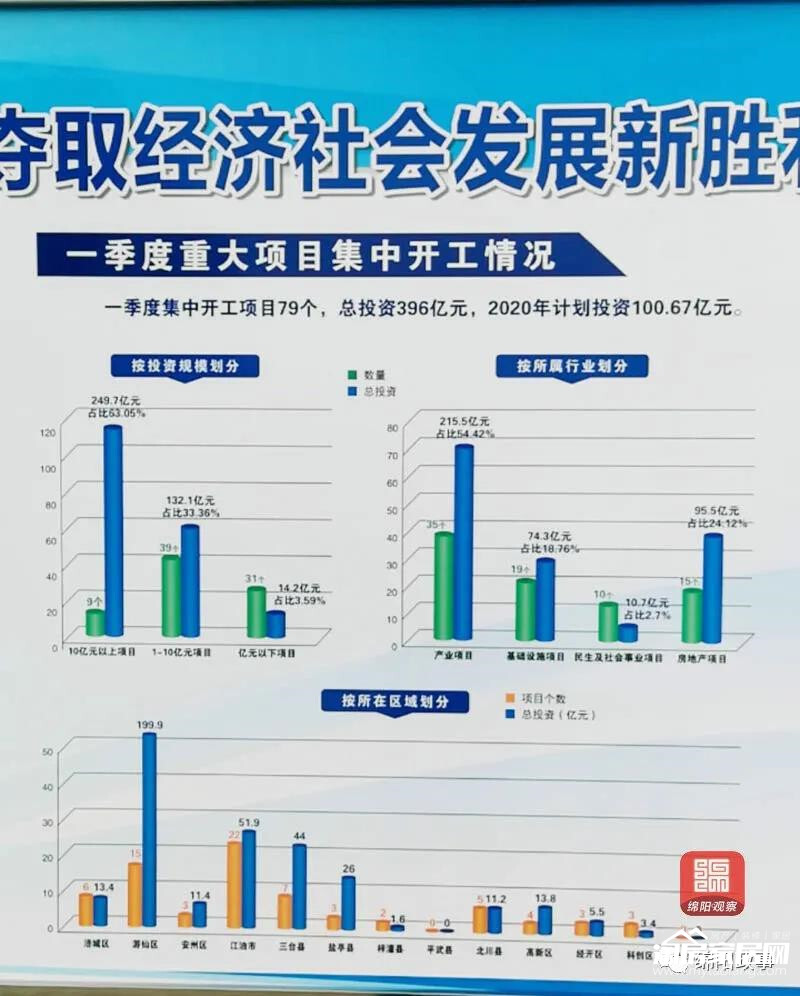 受疫情影响,2020年一季度绵阳集中开工项目仪式推迟,3月26日集中开工79个项目,总投资396亿元。房地产项目15个,总投资95.5亿元,占比24.12%,2020年计划完成投资25.2亿元。