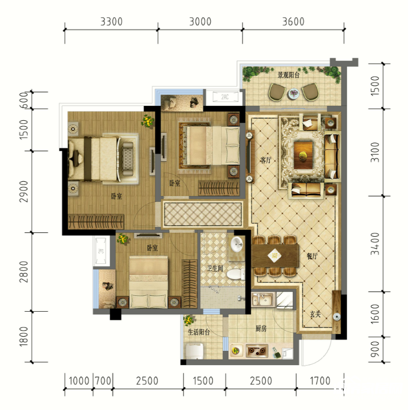 户型面积:90.84㎡三室两厅单卫